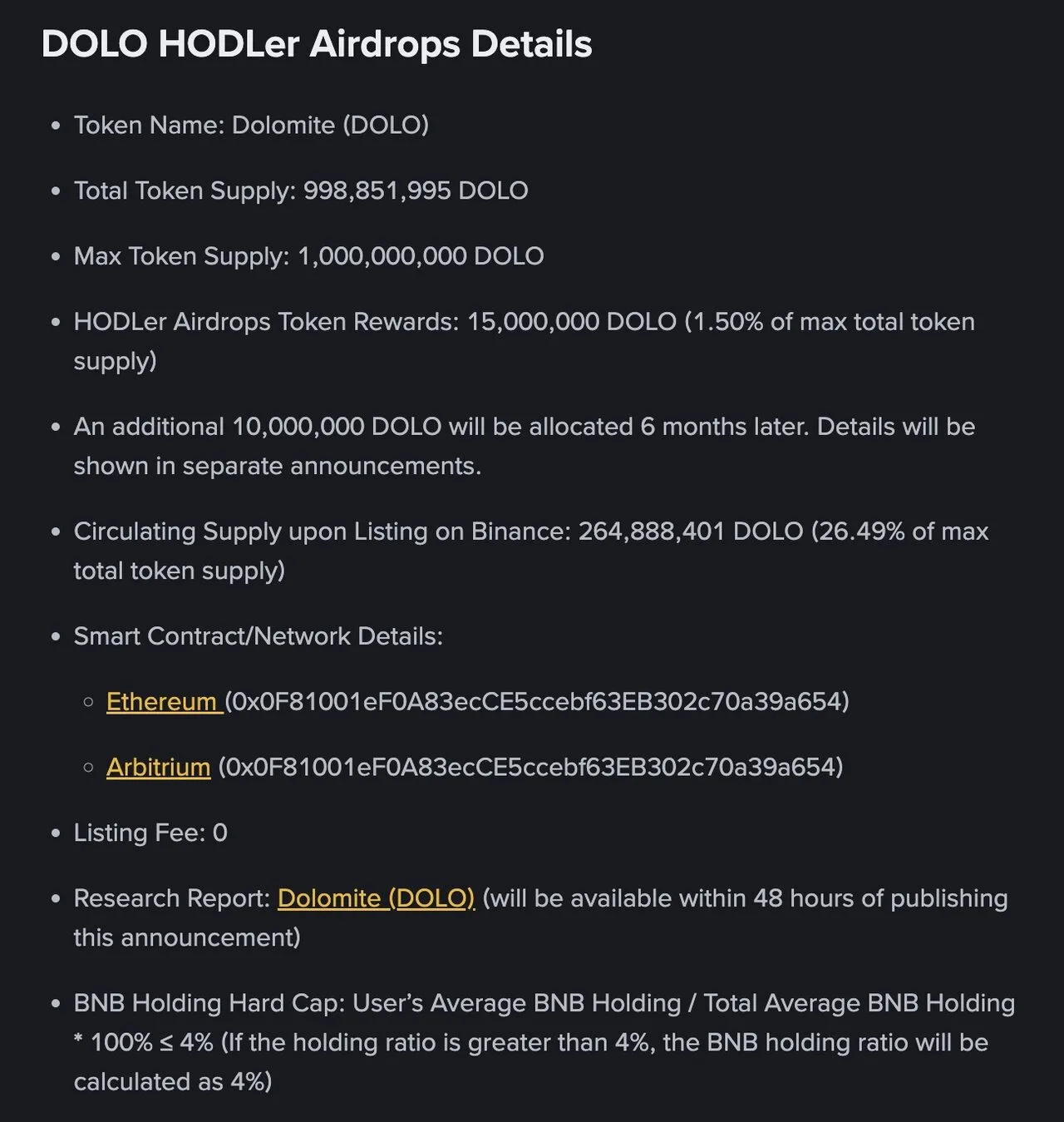 Binance thông báo dự án thứ 33 trên HODLer Airdrop – Dolomite (DOLO), một giao thức thị trường tiền tệ phi tập trung.