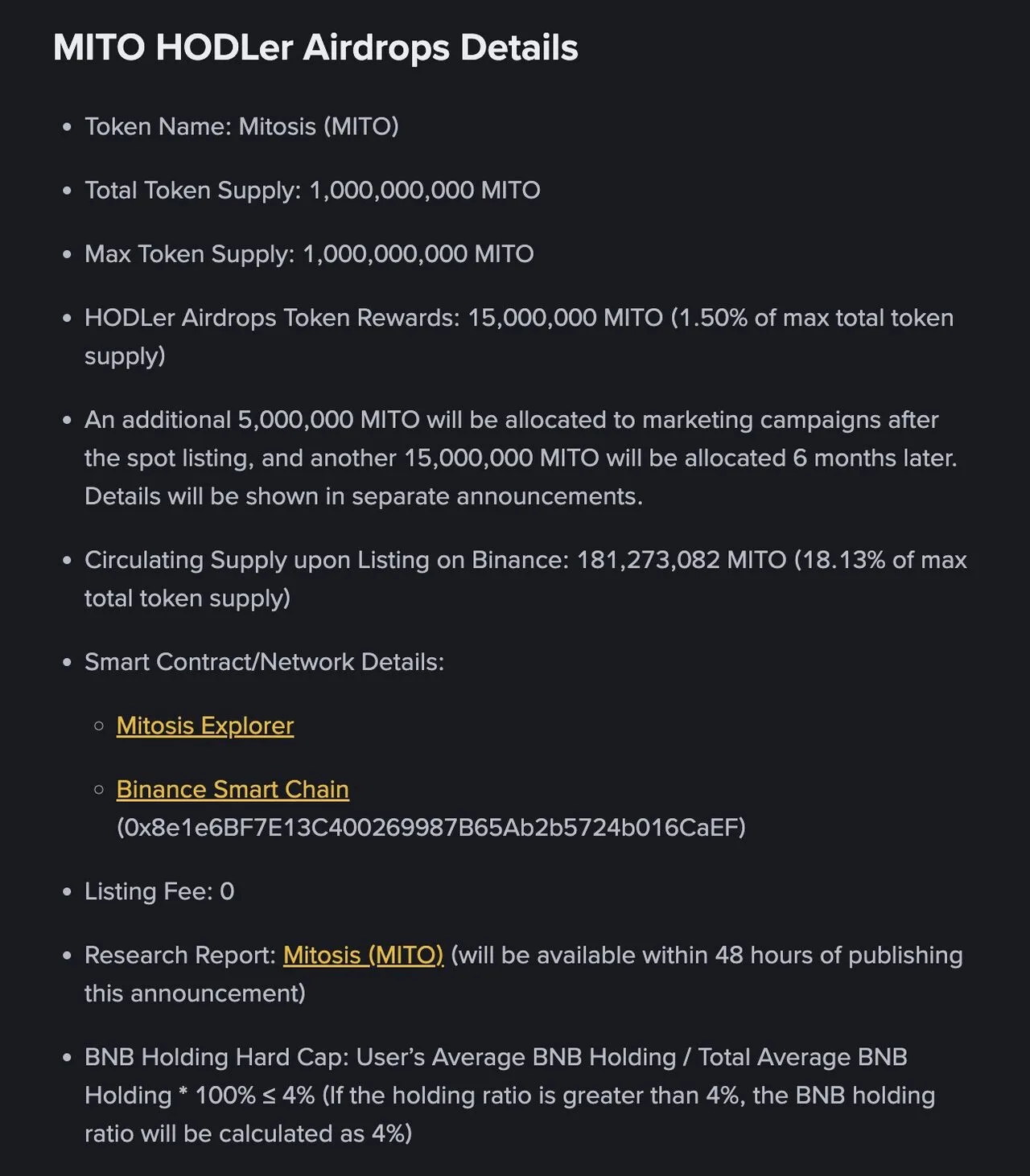 MITO sẽ được Binance niêm yết dưới dạng “seed tag”. Dạng này để phân loại các dự án tiền điện tử thường đang trong giai đoạn phát triển ban đầu và có thể chưa có sản phẩm hoạt động, ngoài ra tiền điện tử niêm yết dạng này cũng có rủi ro cao.