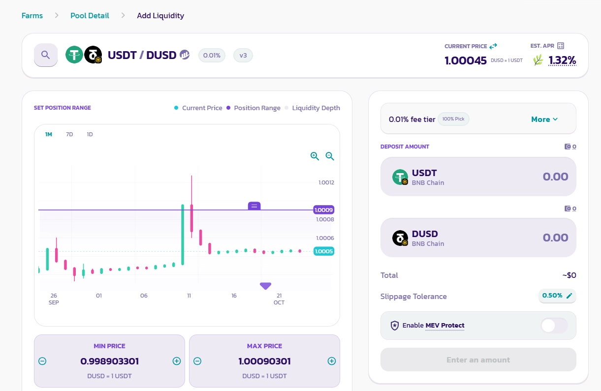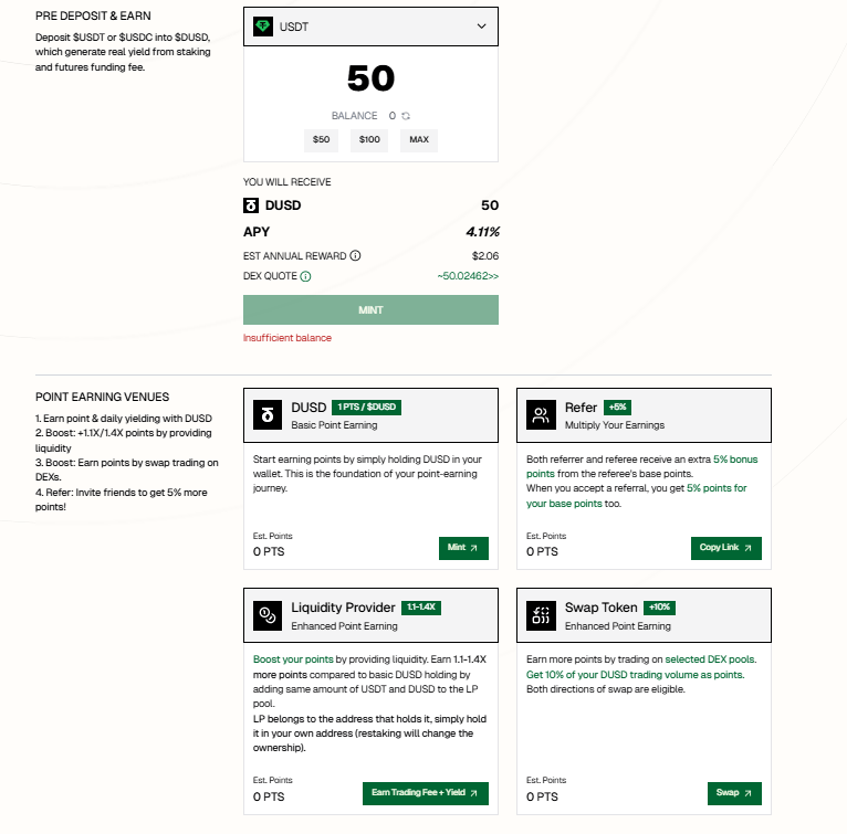 Người dùng đổi USDT/USDC → DUSD (1:1) để nhận điểm qua giao dịch, cung cấp thanh khoản hoặc nắm giữ stablecoin.