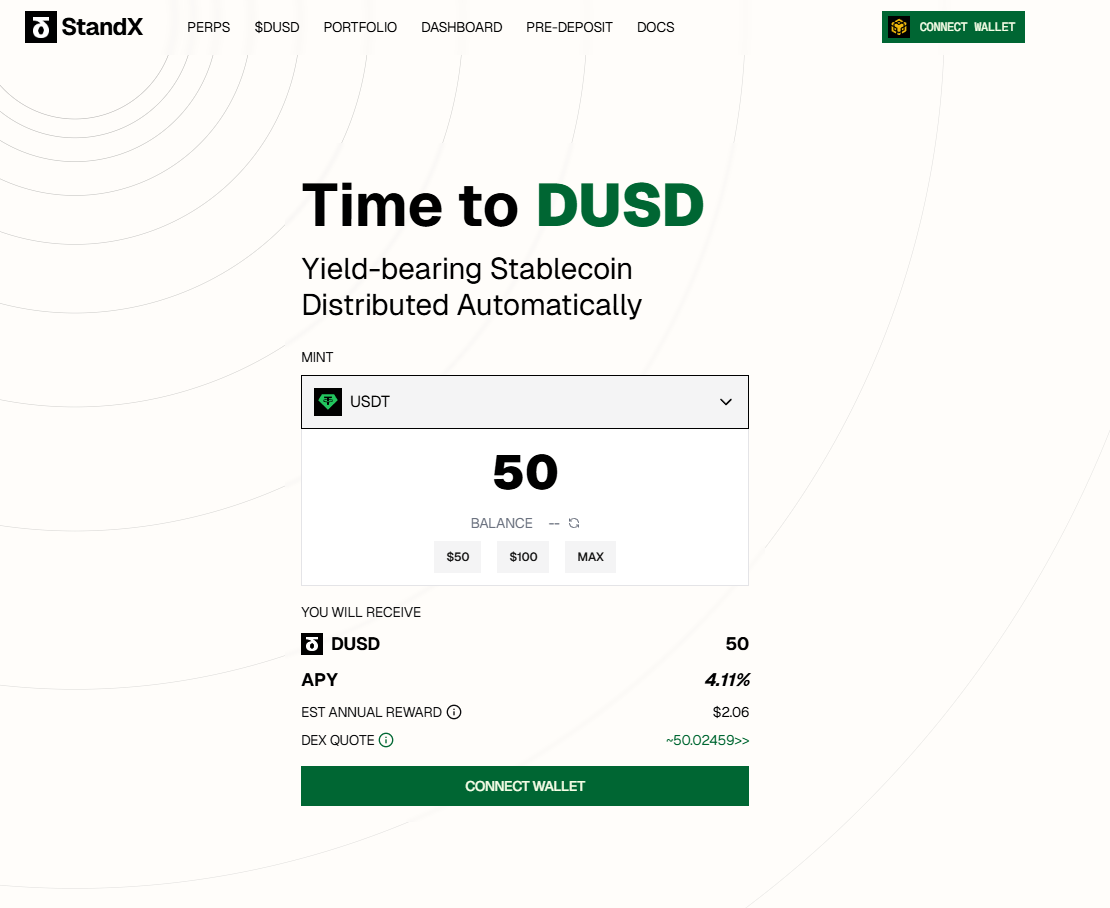 Hiện tại, chiến dịch pre-deposit DUSD của StandX diễn ra đến 31/10 trên BNB Chain, phân phối airdrop theo điểm tích lũy.