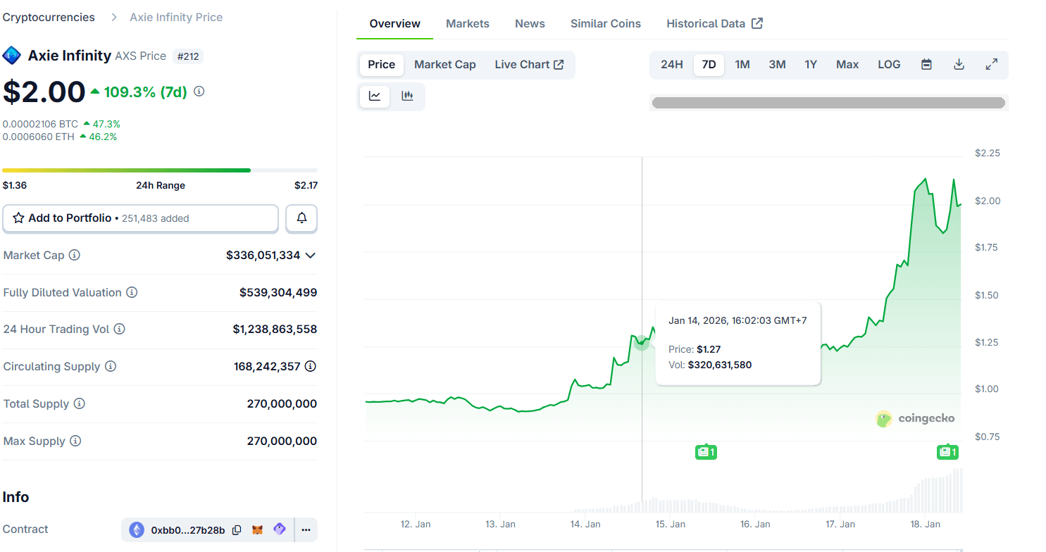Theo dữ liệu từ CoinGecko, AXS đã tăng khoảng 64% trong ngày, lên quanh 2,02 USD, và hơn 100% trong 7 ngày.