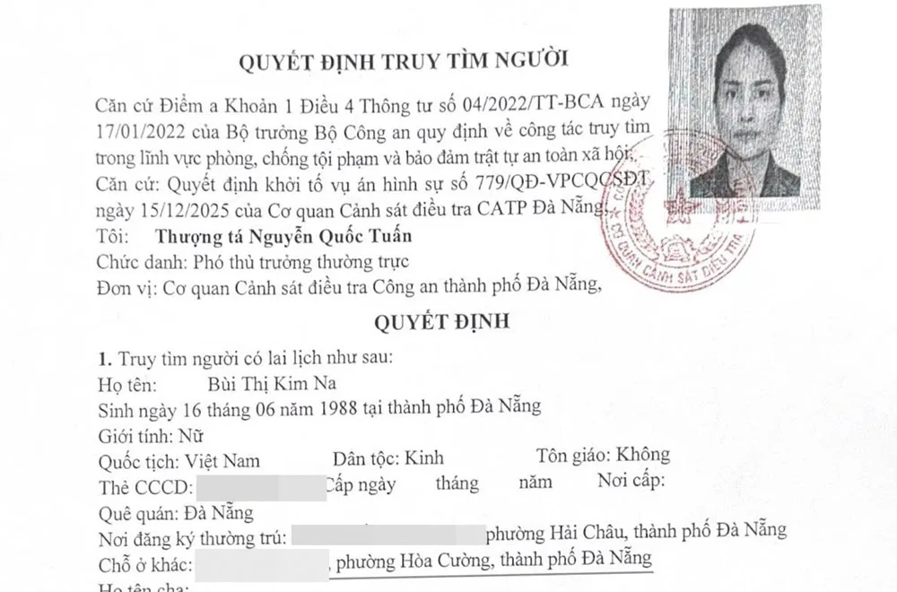 Văn phòng Cơ quan Cảnh sát điều tra Công an TP. Đà Nẵng cho biết đã ban hành quyết định truy tìm đối với Bùi Thị Kim Na (38 tuổi), trú phường Hải Châu, TP. Đà Nẵng.