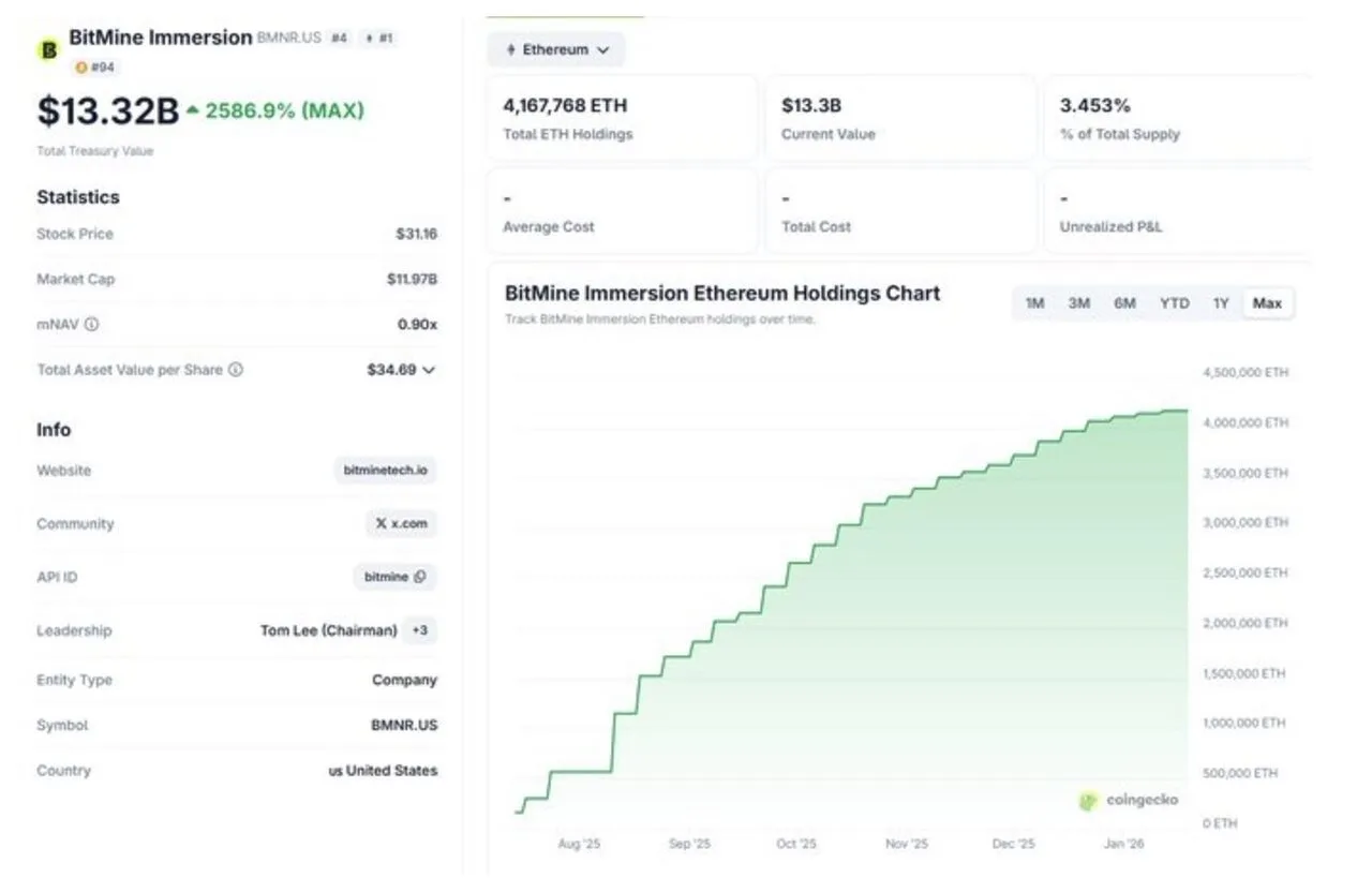 Theo dữ liệu mới nhất, Bitmine Immersion hiện đang kiểm soát hơn 4,167 triệu ETH, tương đương khoảng 3,4% tổng nguồn cung Ethereum đang lưu hành. Với giá trị gần 13,32 tỷ đô la, điều này khiến Bitmine trở thành một trong những người nắm giữ ETH lớn nhất thế giới.