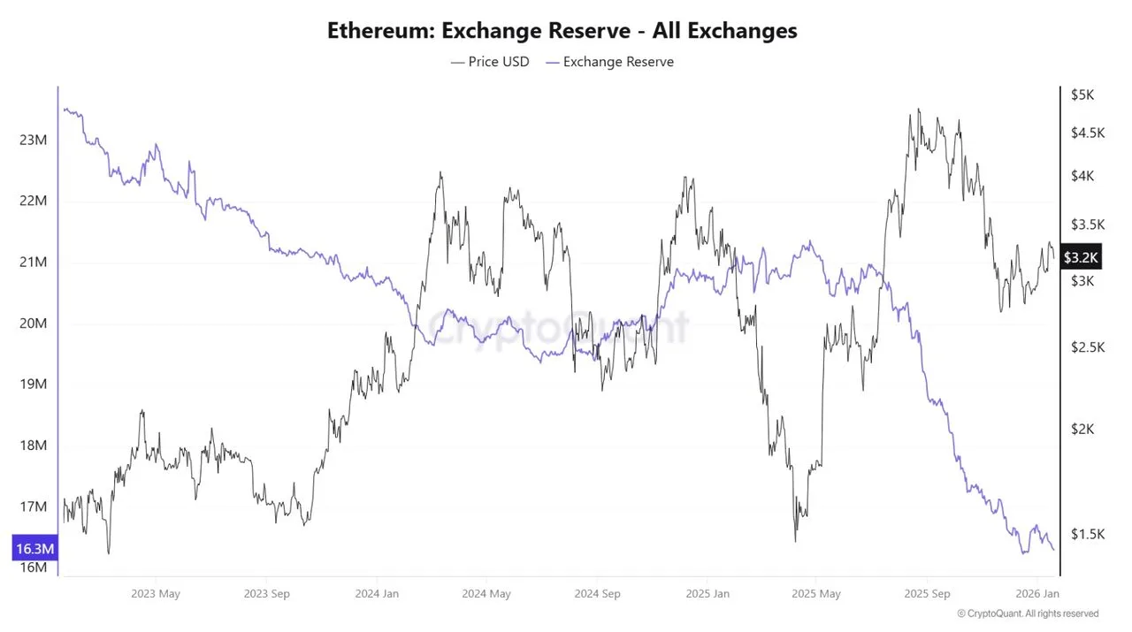 Bitmine Immersion, do Tom Lee dẫn đầu, hiện đã nắm giữ 3,4% tổng lượng cung Ethereum đang lưu hành. Khi Bitmine nổi lên như một trong những người nắm giữ ETH lớn nhất, nguồn cung trên các sàn giao dịch đã giảm mạnh, chỉ còn lại 16,3 triệu ETH để giao dịch.